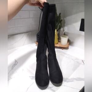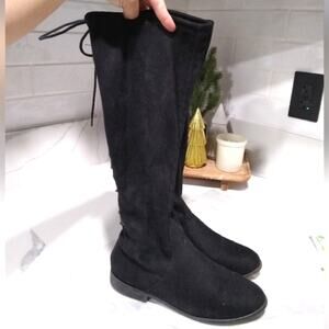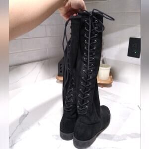 Liquid Black Suede Faux City Classified Women Flat Boots Side Zipper Back Lace Up Knee High