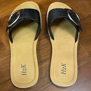 H2K women’s black shimmer sandal slip-ons size 9 with gold buckle