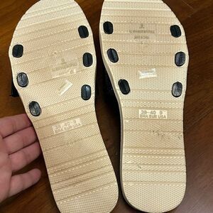 H2K women’s black shimmer sandal slip-ons with gold buckle size 9