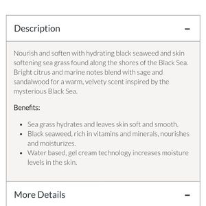 Black Sea Body Cream by H2O is a water-based gel cream technology which forms a light-weight moisture barrier across the skin's surface that holds moisture into the skin while pulling moisture from the atmosphere to the skin's surface for increased hydration.