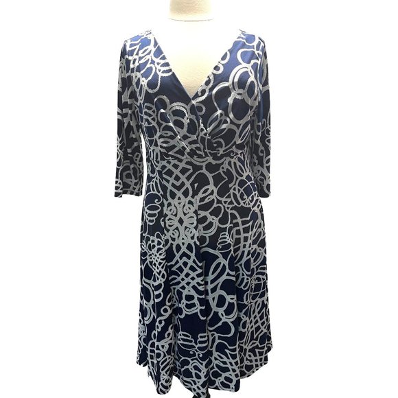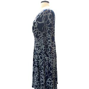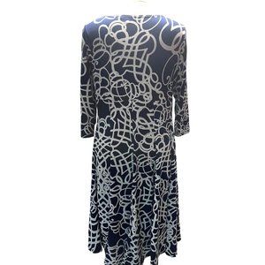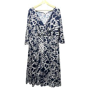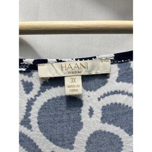 Stunning HAANI Dress in size 3X. Flattering V-Neck with long sleeves with beautiful movement in the flared bottom. Dark blue and white with white embroidered top stitching design. Modest yet very flattering.