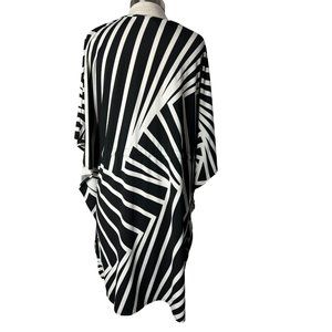 Black and white striped kneelength dress from HAANI. Features a waist tie, short sleeves, a V-neck, and is made of 92% polyester and 8% spandex. Machine washable. Made in China. Chest size is 27 inches, length is 38 inches, waist is 27 inches, and sleeve length is 12 inches.