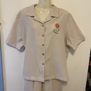 The HABAND 2 Piece Travel Lounge Set in vintage ivory and olive striped pattern is a stylish and versatile outfit set perfect for various occasions such as travel, parties, casual outings, workwear, and business meetings. This set includes a collared top with button closure, short sleeves, and an elastic waist for a comfortable fit. The Capri pants feature a straight leg style and a 20-inch inseam, ideal for warmer seasons like summer, fall, and spring. Made from 100% polyester with a hint of vintage charm, this outfit set from Haband For Her is a must-have for any woman's wardrobe.