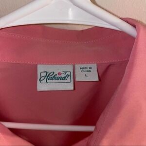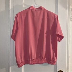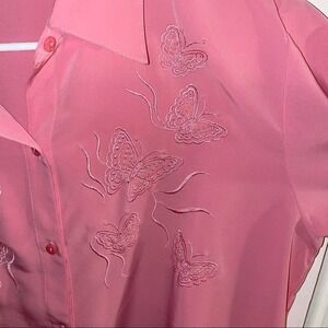 Butterfly embroidery detail, button up, stretchy elastic band at the bottom, shoulder pads, short sleeve