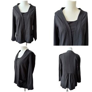 Womens size Medium, black, 2-piece tank and open front cardigan, cardigan has cute pleated back detail and pockets.