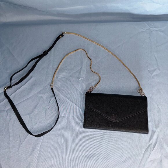 Black and Gold Chain with Adjustable Strap. Black Case Included in Purse. Magnetic clasp. Zipper on Back. Never Used. Plastic still Attached to Mirror. Clear Phone Case and Floral Phone Case Included.