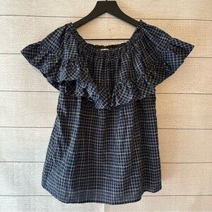 HACHE Ruffle Off The Shoulder Plaid Cotton Blouse Top Blue Small / IT40