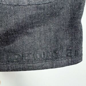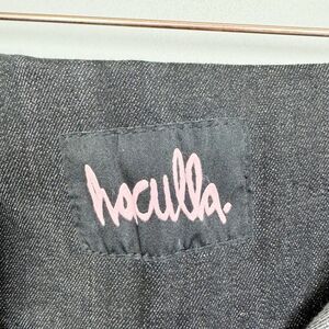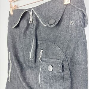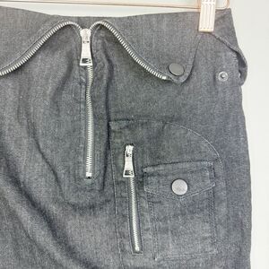 Cute denim style mini skirt by HACULLA. Fold over at the waistband. Zipper fly. Several zipper and snap pocket details. Great condition. Women’s size small (no tag).