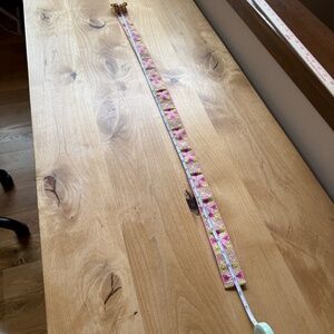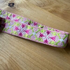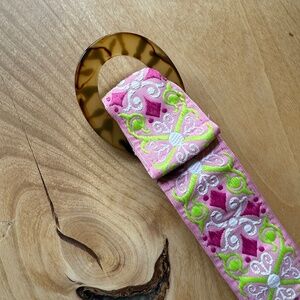 Tags removed, adjustable as the fabric slides through the buckle, pink, white and green criss cross pattern.