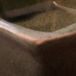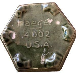 Vintage Haeger Pottery 4002 USA. Speckled olive green hexagon stoneware planter with 6 feet. This pre-owned planter is in excellent condition, though there is a very minor chip on one of the hexagonal edges and on the underside of the planter (where you don't see it at all). Measures approximately 3 inches tall x 6 inches in diameter from hexagonal outer edge to hexagonal outer edge.