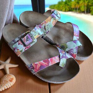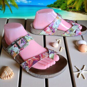 Soft anatomically contoured cork footbed for comfortable support and adjustable buckle strap over the instep for a secure fit.