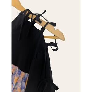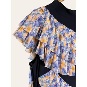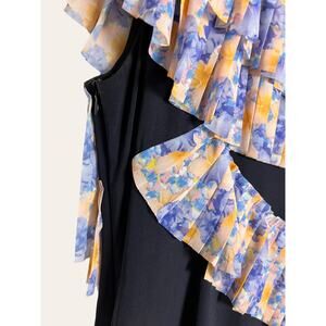 HAGAHI Navy Blue Pleated Floral Print Short Sleeve Asymmetrical Dress Size 6
