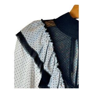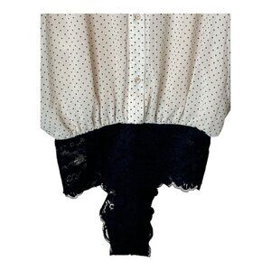 This HAH bodysuit is in a stylish black and white polka dot design with a mesh front, high neckline and long bell sleeves. It is NWT.