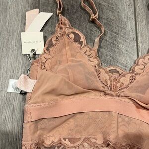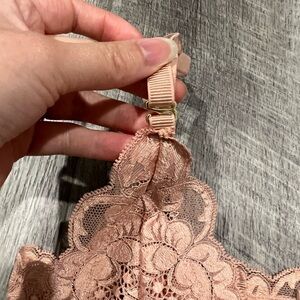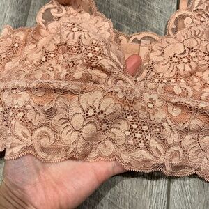 Size XS. Brand new with tags. Retails for $58. Air dry only. Adjustable multi way straps. Peach/tan colored lace material. Triangle like cups with lace band along the bottom. Material is a mix of nylon and spandex.