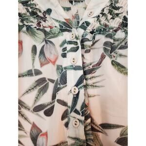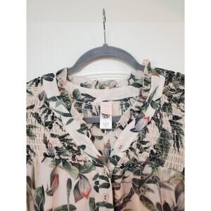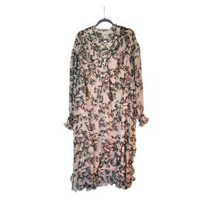 Style: Street Sweeper ruffled side slits oversized midi dress. Flowy and oversized. Mock, ruffled collar that goes to a v-neckline. Button closure down front of bodice (halfway). Stretchy smocking across shoulders and upper back. Swing silhouette. Flowy, sheer baloon sleeves with smocking and ruffles at wrists. No defined waistline. Ties on the sides of each thigh for additional flare. Slits on both sides. Ruffles at hemline. Fully lined. Oversized flower printed on back of skirt. Made in China. Hand Wash Only. 100% Polyester.