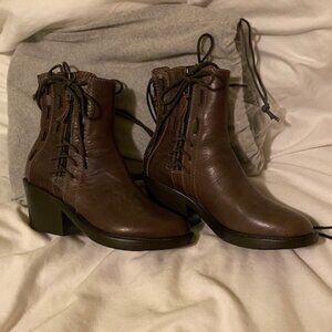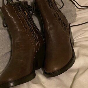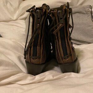 This is a set of Haider Ackerman, French Designer, ankle boots. Worked with Maison Maisell , but he had his own line for a time released by Maisell (hence the Maisell dust bag). Crocodile Ostrich leather, with two sets of zippers (one side and one back) as well as laces. This is a new unused set of ankle boots size 38.5 (roughly size 8 in US)