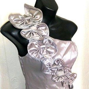 Stunning Metallic Pewter Silver Cascading Bows Detail on One Shoulder Cocktail Mini Dress