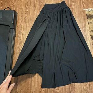 Chic black A-line skirt. Features a stylish slit. Perfect for versatile wear.