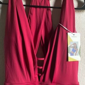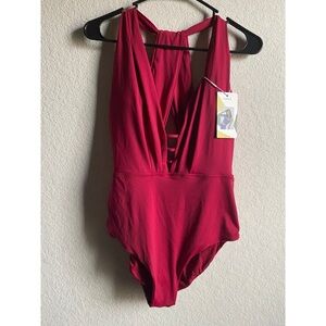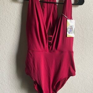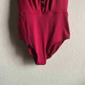 Elegant red one-piece swimsuit. Deep V-neck design. Strappy front detail. Open back style. Perfect for beach or pool.