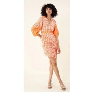 The HALE BOB Draped Midi Dress in size medium is a vibrant and colorful addition to any wardrobe. The geometric retro pattern in orange and blue adds a fun and unique touch, perfect for a party or casual outing. Made from viscose material, this knee-length dress is designed for comfort and style, with a mini and pencil dress style that flatters the figure. Whether you're looking to make a statement or simply bring some color into your life, this Hale Bob dress is sure to turn heads.