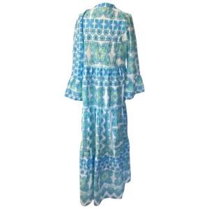 Stylish maxi dress with a vibrant blue and green pattern. Features long sleeves and a flowing design. Button front. Cotton