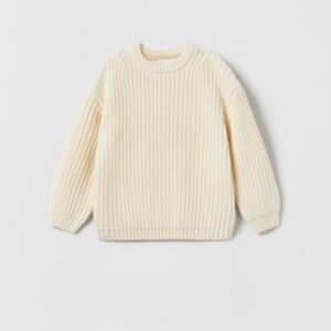 Round neck knit sweater with cuffed long sleeves. Color: Light ecru