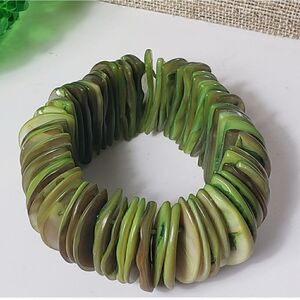 Shells are shades of green with smooth texture and glossy appearance. Some have the expected iridescent shimmer of shells.