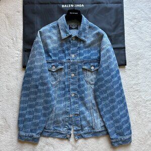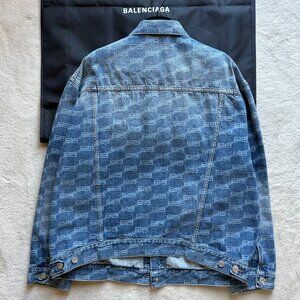 FEATURES: Oversized trucker jacket silhouette. Expertly crafted in Italy from indigo ring cotton denim with all-over BB Monogram laser-print and contrasting heavy-duty stitching throughout. Unifit. LARGED FIT. Classic jean-jacket collar. 6-button front closure. 2 slash pockets at sides. 2 buttoned pockets at chest. Slightly longer sleeves with button-closure barrel cuffs. Adjustable button tabs at rear waist. Balenciaga signature detail engraved in all metal buttons. Includes Balenciaga GARMENT BAG + Balenciaga Velvet HANGER.