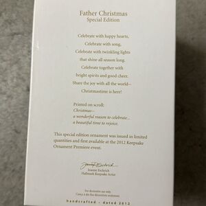 This listing is for Hallmark Limited Edition ornament called "FATHER CHRISTMAS". The ornament is dated 2012. This beautiful ornament is handcrafted and fabric. Father Christmas wears a purple robe trimmed in golden accents. The sentiment on the scroll in the basket on his back reads: "Christmas - a wonderful reason to celebrate..a beautiful time to rejoice!." Measures 5-3/4" tall.