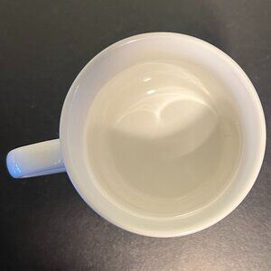 Charming ceramic tea cup with both sides featuring a graphic of a small purple teapot and a purple and yellow diamond shaped frame with purple text that reads, As For Me, Make Mine Tea! Robin eggshell blue  background with narrow yellow stripes. White interior, rim, and handle. Measures 3.75” tall with a 3” diameter. Holds 9 fluid oz. From Hallmark’s  Mug Mate collection. Made in Japan