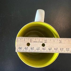 Measures approximately 3 3/4" tall x 3" wide at opening and holds 10 oz. Dishwasher and microwave safe.
