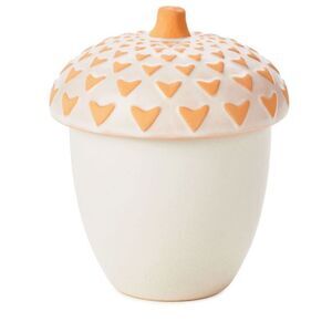 Acorn-shaped ceramic jar with lid features soy-blend wax, single-wick scented candle.