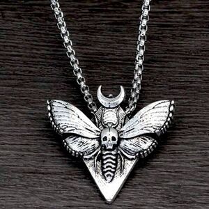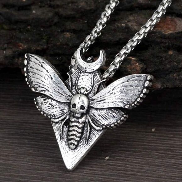 HALLOWEEN SALE Silver Vintage Death Moth Lunar Moon Pendant Necklace