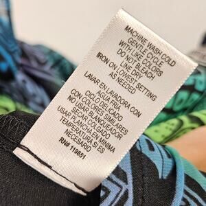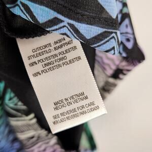 Pattern: Colorful geometric/tribal print in shades of green, blue, and black