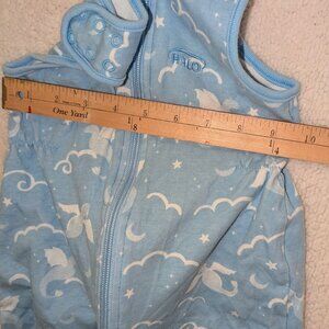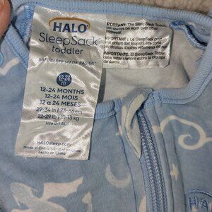 Slightly used Halo brand Toddler SleepSack for babies that are beginning to crawl and walk. 100% blue cotton with flying dragons. 12-24 months. Inverted zipper for easy diaper change. Adjustable snap straps to grow with your child. Ankle cuffs roll up and down for the perfect fit.