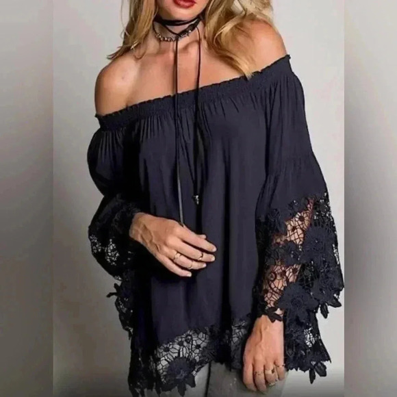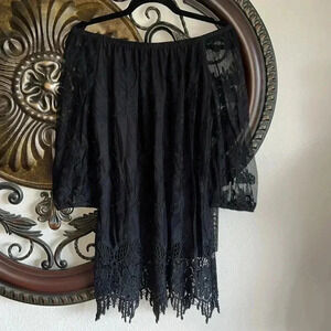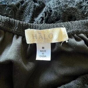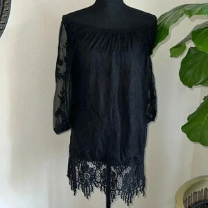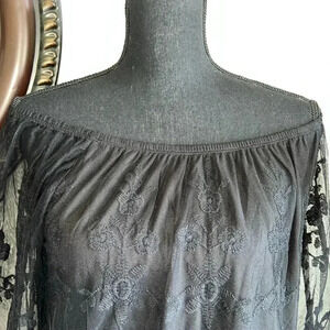 HALO Black sheer, lace, floral, off the shoulder. Elastic neckline, 3/4 Sleeve, lined in wonderful condition! No holes or stains. Size: Medium ***Model wearing similar top***