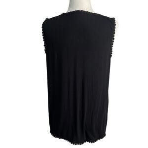 Elevate your summer wardrobe with our black sleeveless top featuring a trendy pom pom trim and a relaxed fit.