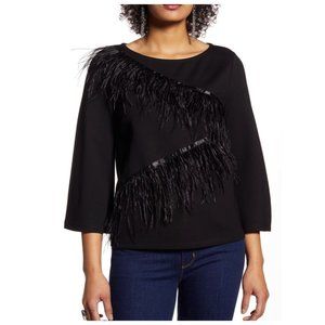 HALOGEN Black Zigzag Feather Trim Bell Sleeve Bateau Neck Ponte Top Women XS NWT