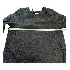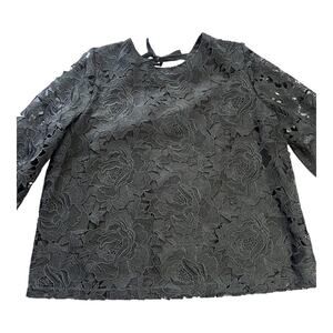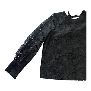 Halogen lace blouse in black floral cutout lace, a romantic-meets-modern statement piece that instantly elevates your wardrobe. The intricate floral overlay creates dimension and texture, while the semi-sheer sleeves and back keyhole tie detail add subtle drama. Lightweight yet structured, this top moves with you—graceful for evenings out yet polished enough for work-to-dinner transitions.