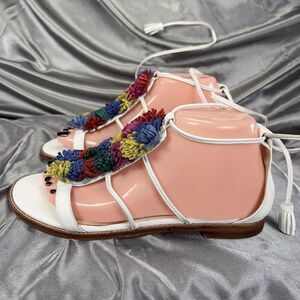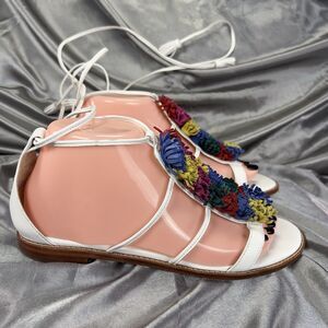 HALOGEN White Leather Flat Gladiator Lace Up Wrap Pom Sandals Women Size 7.5 GUC