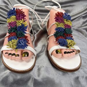 HALOGEN Gladiator Lace Up Sandals Women’s 7.5 White Leather Flats Wrap Pom Poms