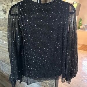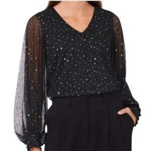 Details: Lustrous sequins elevate this crinkled chiffon top framed by sheer billowy sleeves