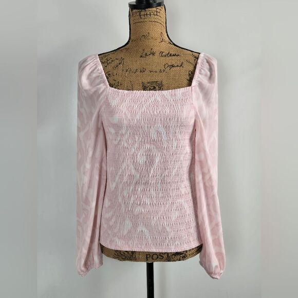 HALOGEN Smocked Long Puff Sleeve Blouse Sz S Light Pink & White