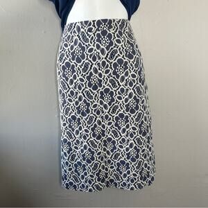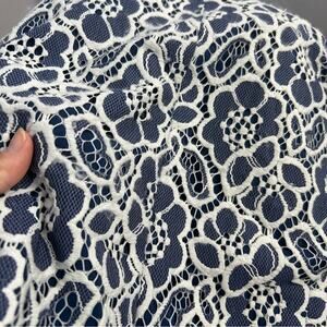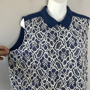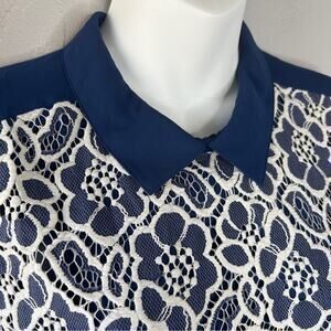 Sleeveless collared top in a dark blue with white lace overlay on front and thin solid dark blue on back with zip closure. Skirt is dark blue with white lace overlay all around, waistband has no stretch, zips up in the back. Slit in back is sewn at bottom, but can be cut if needed. Skirt is lined.