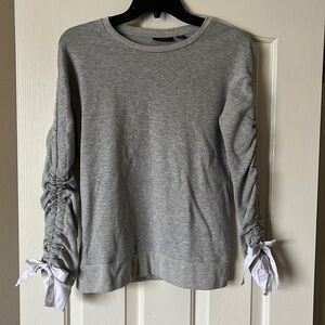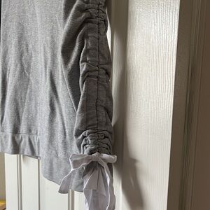 This gray sweatshirt is in excellent condition. It has a bow at the end of each sleeve that is adjustable. Length is 23 1/2 inches and armpit to armpit is 17 inches. Halogen (at Nordstroms)