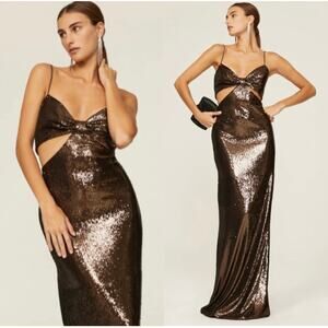 HALSTON Chloe Gown Cut Out Maxi Dress in Sequins Espresso Brown Size 8