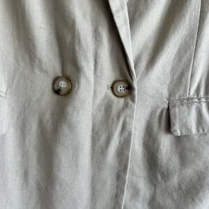Modern minimalism meets quiet luxury in this structured sleeveless blazer by Halston. Made from a breathable linen-viscose blend with full lining, this piece features a longline silhouette, notched lapels, and double-breasted tortoiseshell buttons. A perfect neutral layering piece for transitional weather and tailored moments.