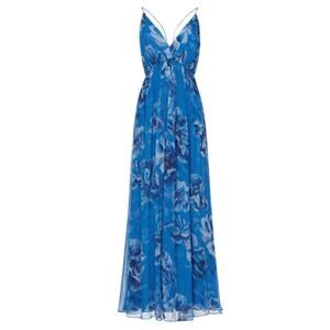 Blue floral chiffon (100% Viscose). A-line. Sleeveless. V-neck. Back zipper closure.