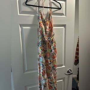 linen halter dress. stretchy back and tie up neck