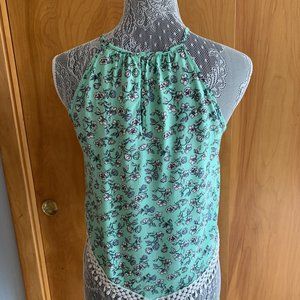 Halter Top is a lovely aqua floral print, lace hem accent with a keyhole opening in the back. Made of a woven comfortable fabric.